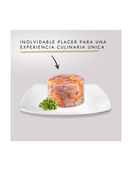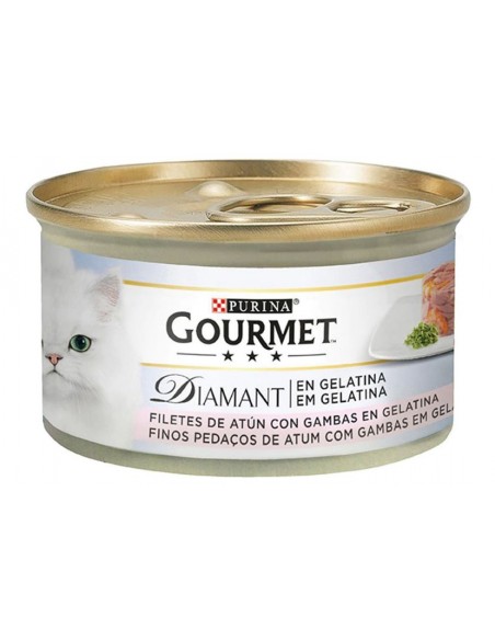 Latas gourmet para gatos exigentes. Deliciosas y finas láminas de atún con gambas en un pastel de gelatina. ¡Tu gato no podrá resistirse! Las latas gourmet para gatos de Purina Diamant satisfacen las necesidades de los gatos adultos más exigentes gracias a su enorme palatividad. Con más de un 54% de atún hará las delicias de tu amigo felino. Un imprescindible en casa de cualquier gato adulto.