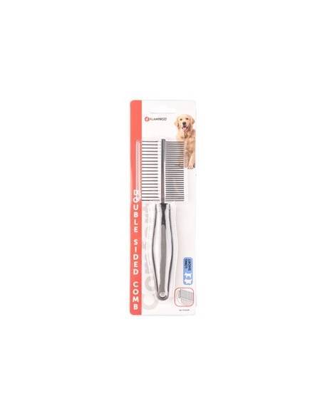 Peine doble para eliminar enredos en pelo de perros y gatos. Dos tipos de paso para cada necesidad. Este peine para perros y gato posee dos filas de púas redondeadas de acero inoxidable. Una más ancha para el pelaje de cuerpo y otra más estrecha para la zona de las patas o de la carita. Se puede utilizar en perros y gatos de todas las razas, incluido aquellos de pelaje largo y denso.